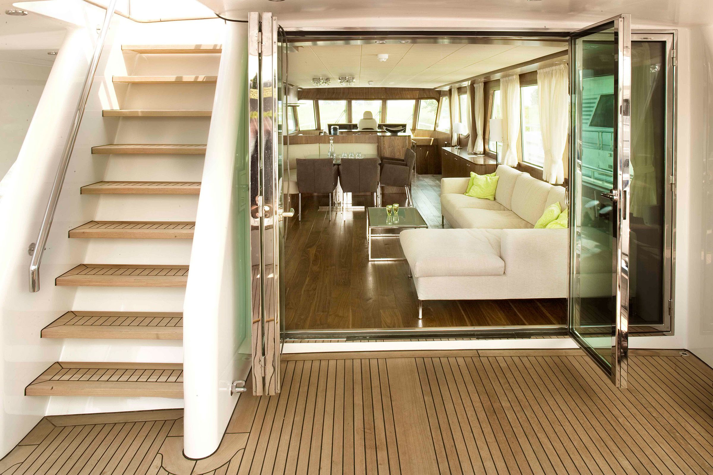 In the main living area, the walnut floor extends seamlessly across the open layout, enhancing the yacht's spaciousness. The Tung Oil Hardwax finish provides a soft sheen, ensuring durability and a refined appearance.