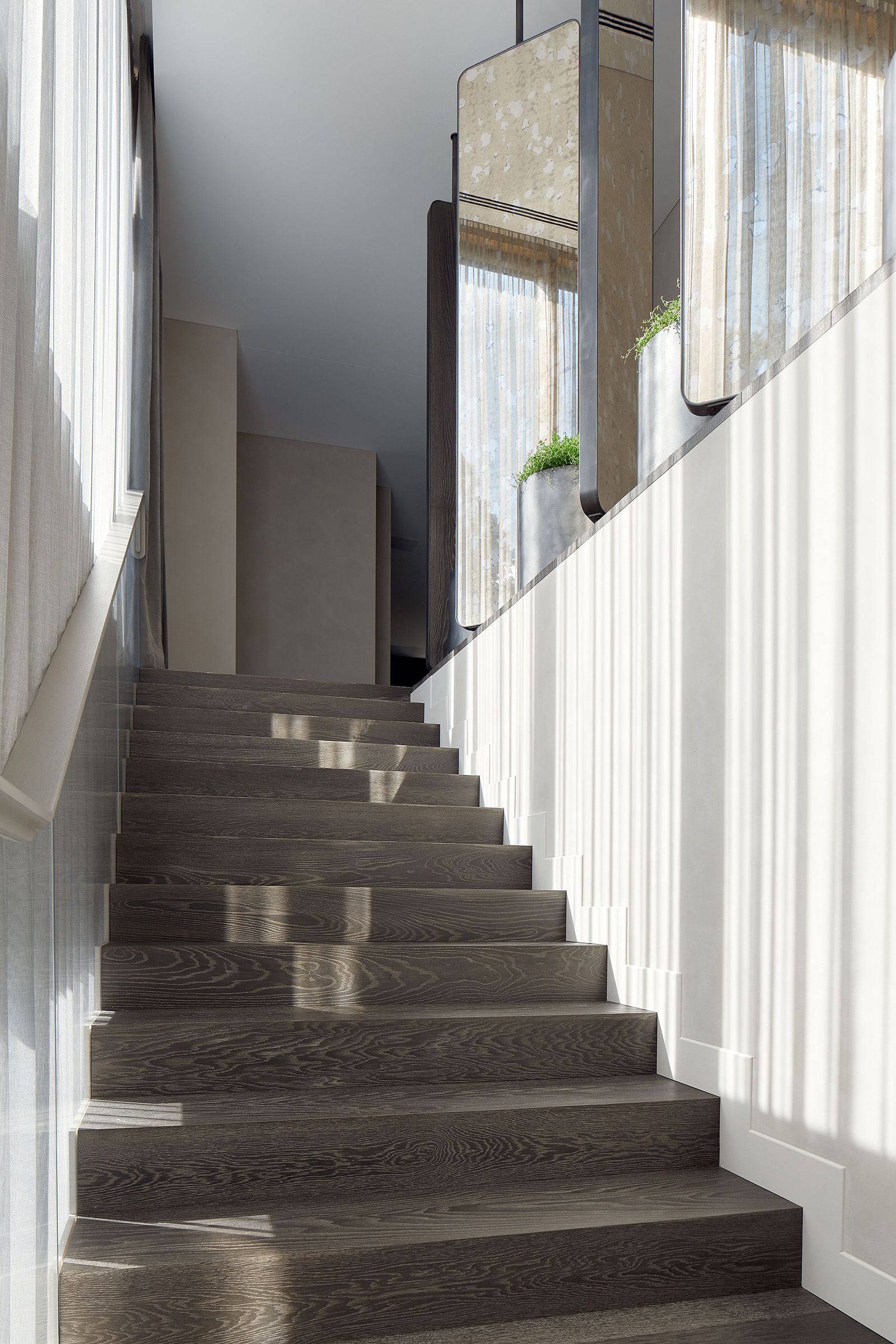 The staircase is finished in the same planks, with the grain running smoothly across both steps and risers. This detail gives the stairs a solid, consistent feel and connects the upper and lower levels as part of the same design language.