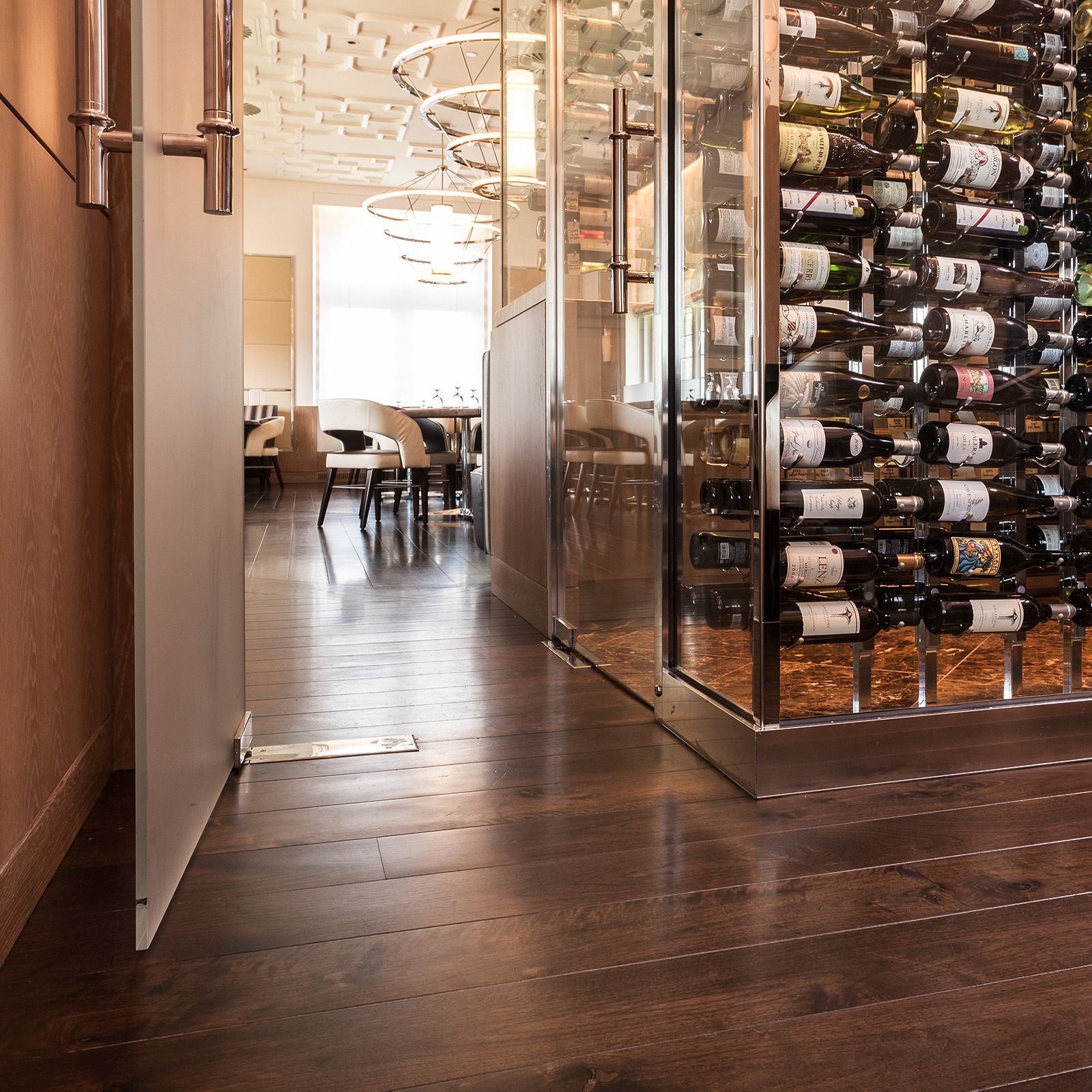 The Espresso Brown Satin Poly finish imparts a warm, luxurious sheen, creating a welcoming ambiance. The 10-inch fixed width pattern adds a touch of bespoke craftsmanship, aligning with the restaurant's reputation for culinary excellence.