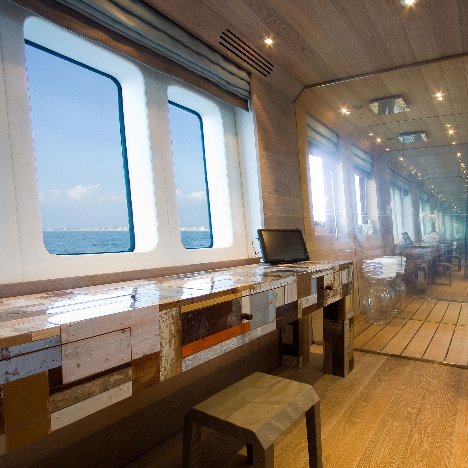 Each plank's custom widths and unique finishing contribute to the bespoke nature of the yacht, blending modern design with traditional craftsmanship for a timeless, distinct interior.