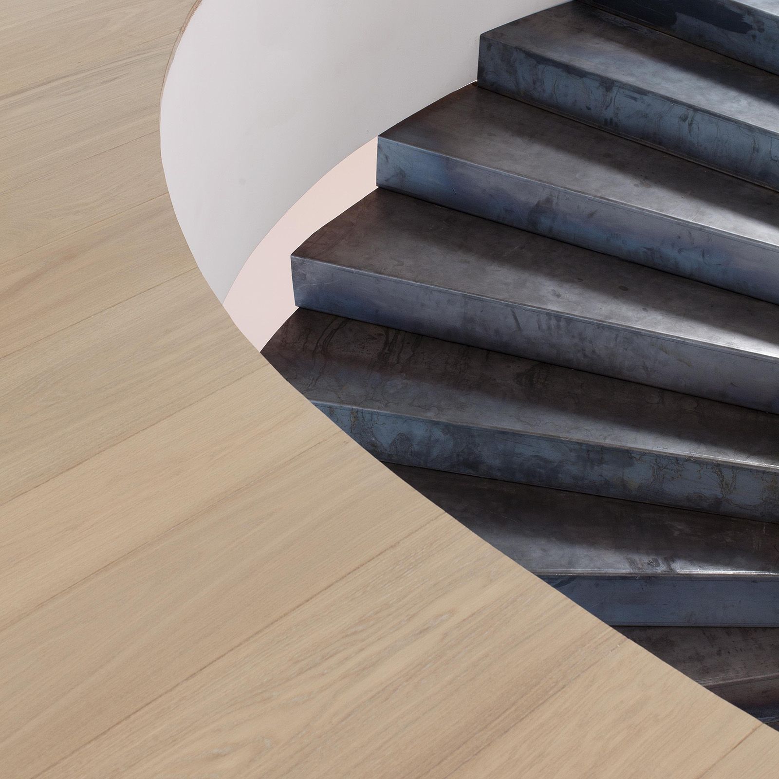 The main living areas showcase Solid American White Oak, deeply smoked and finished with a whitewash of natural oil. This treatment enhances the wood's rich textures and subtle grain patterns, creating a warm, inviting atmosphere. Wide planks, 17 to 35 cm in width, amplify the space's grandeur and openness.