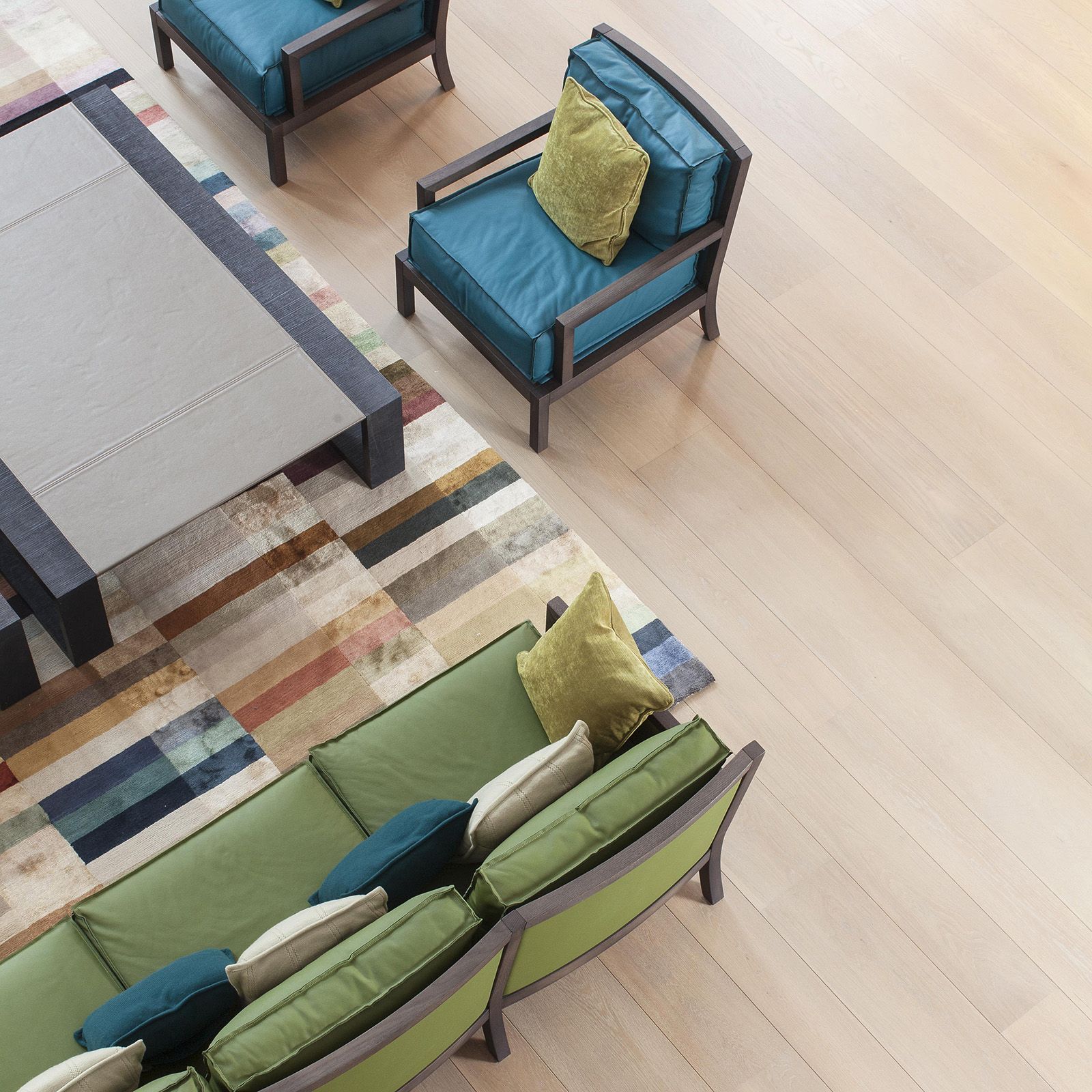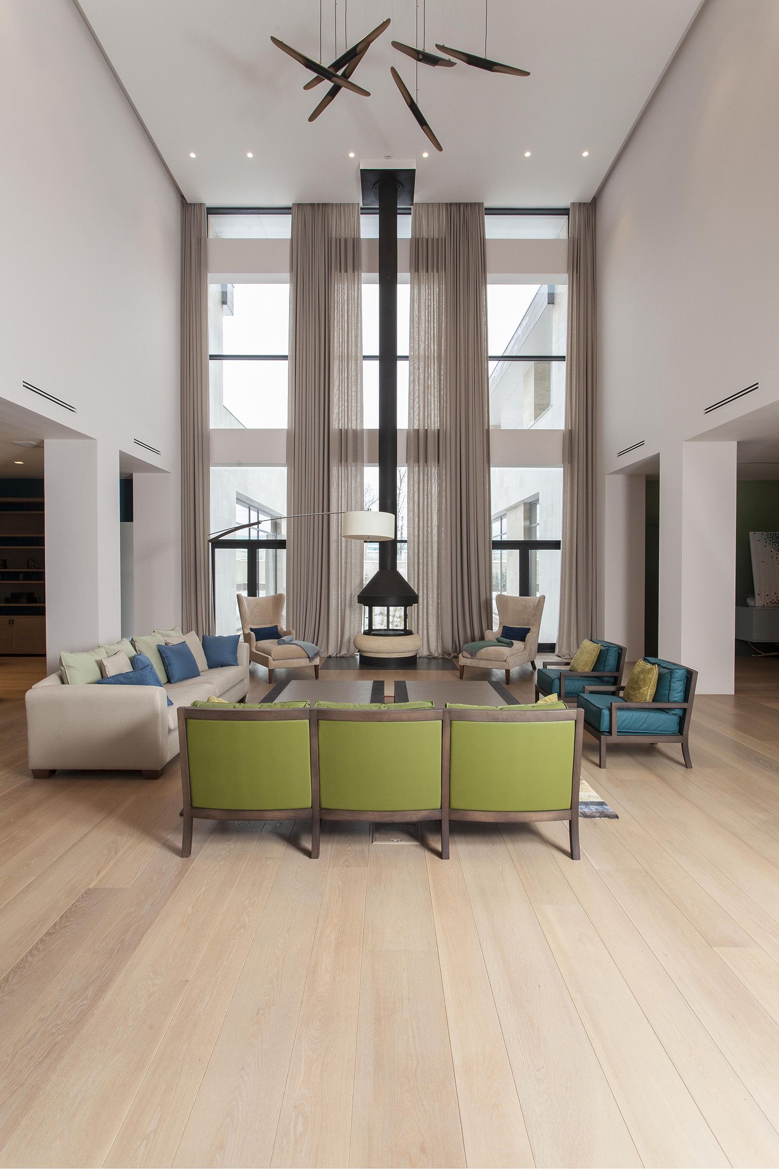 Wide planks, 17 to 35 cm in width, amplify the space's grandeur and openness. Architectural elements like curved staircases and expansive windows are beautifully complemented by the flooring, anchoring the design in a timeless aesthetic.