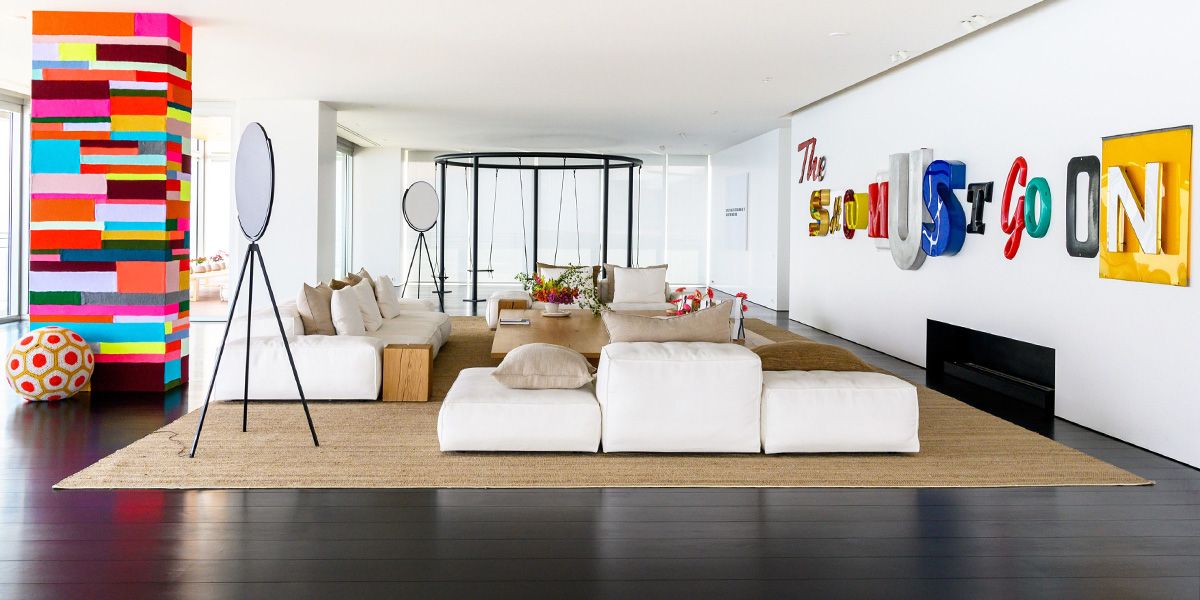 Born in Lebanon, Mikati is based in London but comes to Beirut regularly, and when she does, this large apartment - an entire floor - is dedicated to family, friends, art, and fun. “In the beginning it was hard, it was like a hotel," Mikati tells in an interview at Architectural Digest. "This is a new building and everything looked the same. I thought it was never going to work: one big open space, concrete, and windows.” Mikati wanted the house to be warm and colorful, and to have art in a neutral space, not to send too many messages at once.
